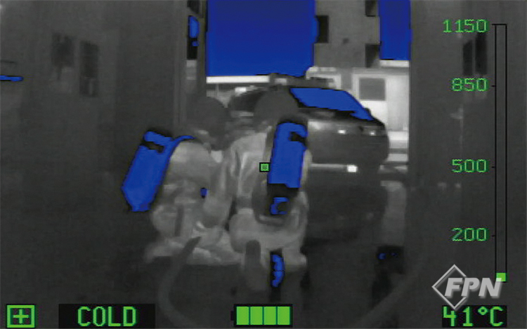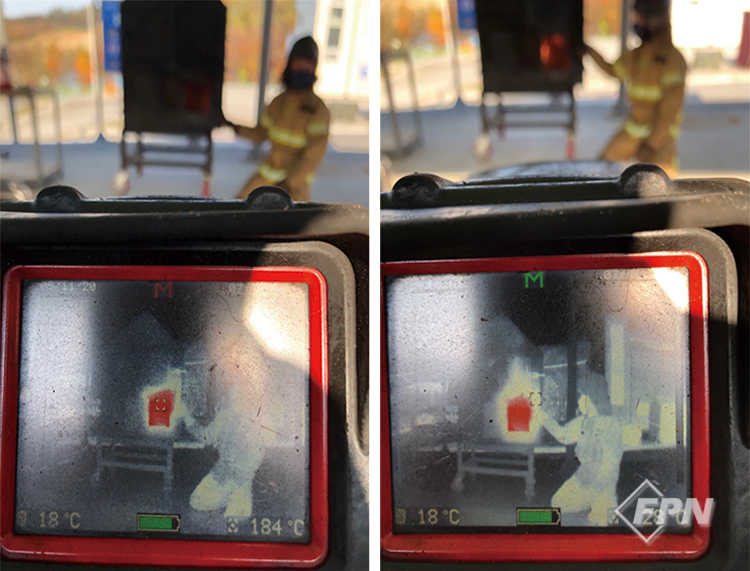 이럴 때 TIC를 사용해 관창수가 주수하는 물줄기가 정확히 목표하는 곳에 도달하는지를 확인하는데 사용([그림 8] 참조)할 수 있습니다. 건축물 내부에서 실시하는 화재진압 활동뿐 아니라 실외에서 실시하는 화재진압 활동에서도 TIC를 활용해 효과적인 진압 작전을 할 수 있을 겁니다.