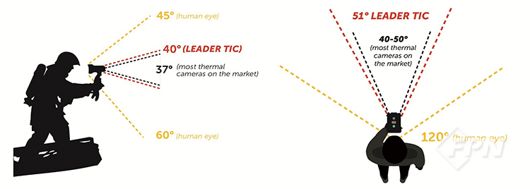 일반적으로 인간의 양안 시야각은 수평 120°, 수직 105°(위 45°ㆍ아래 60°) 범위입니다. TIC의 시야각은 이보다 더 좁습니다. 또 진압대원의 시야는 공기호흡기 면체를 착용하면 훨씬 더 좁아집니다.