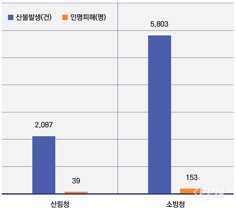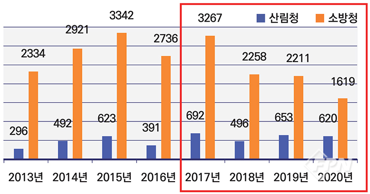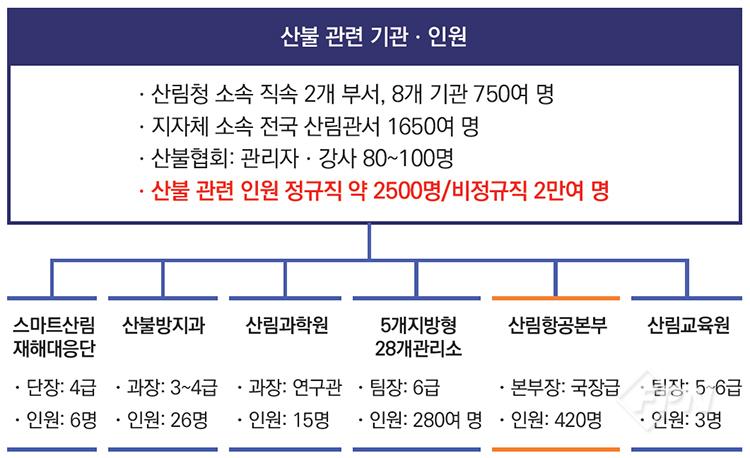산림청은 산불관리를 위해 2개 부서, 8개 기관, 수천 명의 전담직원에, 연간 소방청 전체 예산의 2배 가까이 되는 막대한 예산을 쓰고 있다.