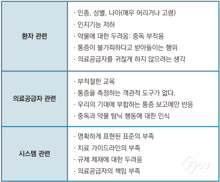 통증 관리에 관한 연구와 정보가 계속 증가하는데도 통증에 대한 과소치료는 계속되고 있습니다. 모든 환자가 통증에 대한 과소치료에 노출돼 있는데 특히 하위집단이나 노인, 아주 젊은 층, 인지 능력이 떨어지는 집단이 더욱 심하다고 합니다.