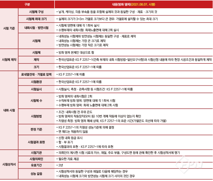 방화 댐퍼가 동작하는 시점에서 송풍기가 가동되고 있어 기류가 이동하는 압력에서 완전한 폐쇄가 가능해야 한다. 따라서 동적 시스템을 기준으로 방화 댐퍼의 성능을 확인해야 한다.