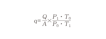 q: 시험체의 단위 개구 면적, 단위 시간당 통기량(㎥/㎡.min) Q: 측정 시 공기 온도에서의 단위 시간당 전체 통기량(㎥/㎡.min) A: 시험체의 개구 면적(㎡) - 방화 댐퍼의 케이싱 안쪽 면적 P0: 101.3(k㎩) P1: 풍량 측정부 관 내의 기압(㎩) T0: 273+20=293(K) T1: 풍량 측정부 관 내의 공기 온도(K)