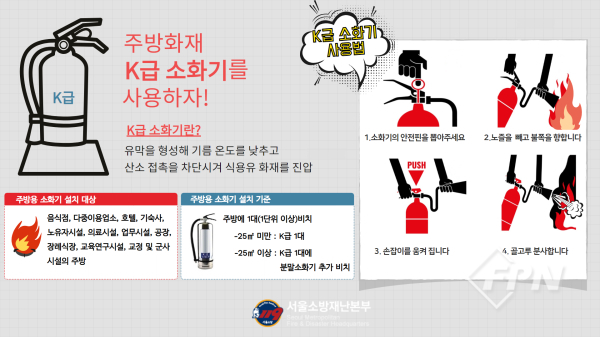 음식점에서 주로 발생하는 ‘식용유 화재’는 화재를 진압해도 재발화할 가능성이 높고 물을 부었을 땐 화재가 확대될 가능성이 높다. ‘K급 소화기’는 기름 표면에 유막층을 형성해 산소를 차단하고 기름의 온도를 낮춰 재발화를 막는 역할을 한다.