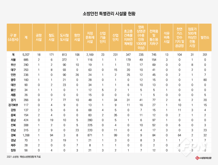 2021년 예방소방행정 통계에 따르면 ‘특별관리 시설물’로 분류되는 대규모 주요시설은 전국에 5천 개소가 넘는다. 소방청은 이 시설물 중 일부를 안전진단 대상 범주로 설정하는 방안을 고려 중이다.