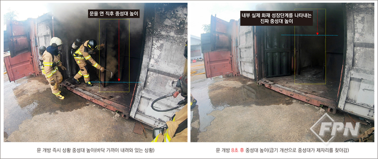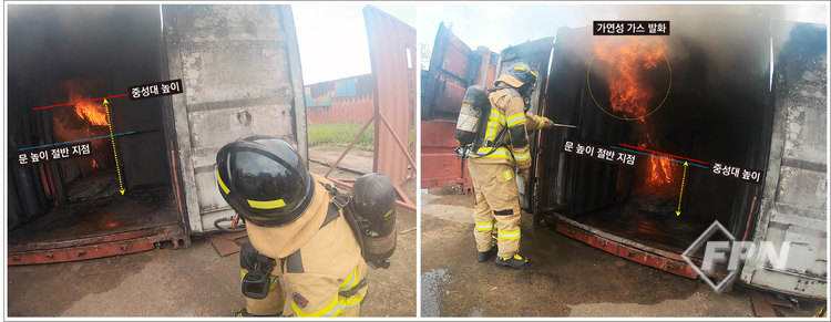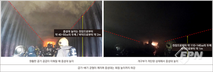 반대로 급ㆍ배기가 원활히 진행되는 Uni-Direction 공기유동경로를 가진 현장에서는 문을 열었을 때 보이는 중성대 높이가 실제 화재발달 단계를 나타낼 확률이 상당히 높습니다.