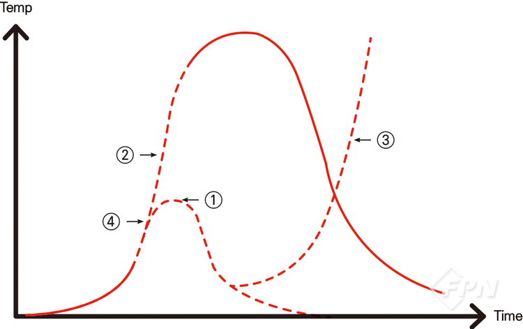 ②번 곡선처럼 화재가 충분한 공기를 공급받으며 최성기까지 도달하는 경우와 ③번 곡선처럼 산소가 부족해 온도, 압력이 떨어지는 과정에서 열기로 인한 개구부 파괴(창문 등), 진압대원의 내부 진입을 위한 문 개방 등 여러 요소로 인해 다시 화재가 발달하는 여러 곡선을 그리게 됩니다.