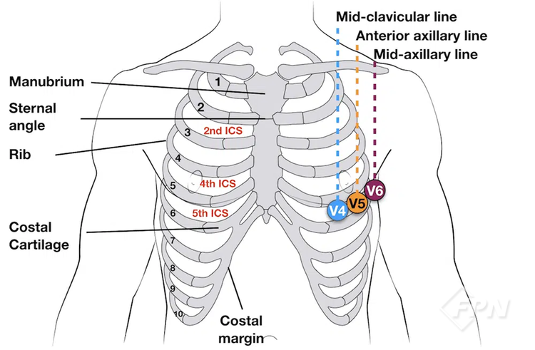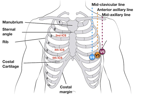 빗장중간선과 5번 갈비 사이 공간이 만나는 지점은 V4, 동일 선상으로 앞 겨드랑 선에 V5, 중간 겨드랑 선에 V6를 붙입니다. V3는 V2와 V4 사이에 붙이면 됩니다. 이게 우리가 배웠던 교과서적인 방법입니다.