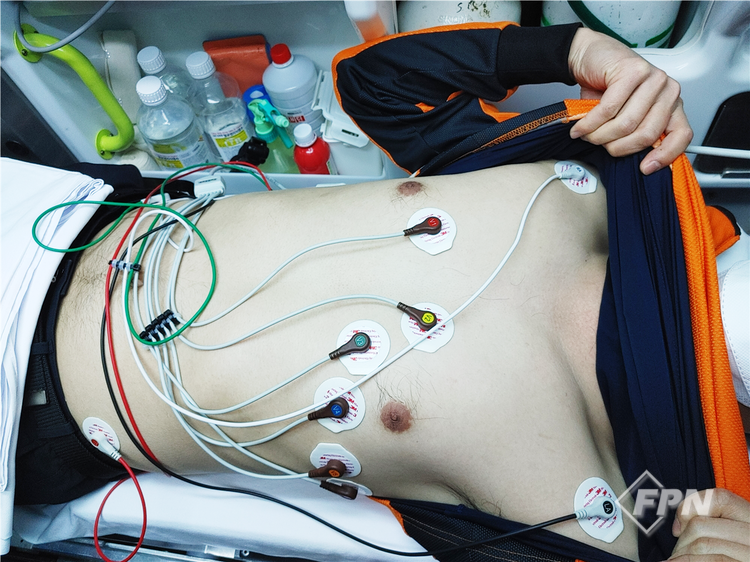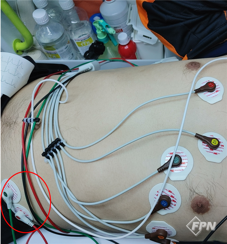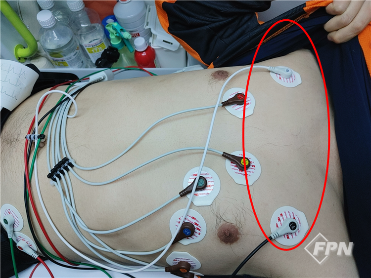 다음은 환자의 안정입니다. 심전도를 촬영해야 할 환자는 흉통이나 호흡곤란 등을 호소할 수 있습니다. 환자가 벌벌 떨거나, 움직이거나, 불안정한 상태라면, 또 구급차가 움직이는 중이라면 베이스라인이 흔들리는 등 정확한 측정이 안 될 수도 있습니다. 가능한 환자를 안정시키고 구급차 출발 직전에 측정을 진행하는 게 좋습니다.