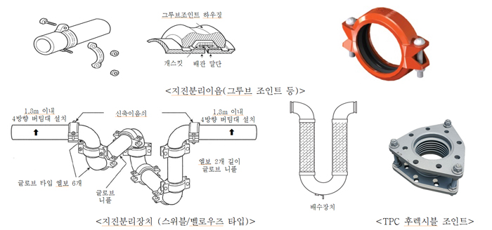 이런 경우뿐 아니라 건축물을 보호하기 위해 익스펜션조인트를 설치할 경우 그 부분을 관통하는 모든 배관에도 익스펜션조인트를 설치해야 한다. 이때 발생하는 건축물의 변위 이상을 수용할 수 있는 지진분리장치를 설치해야 한다.