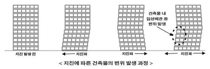 지진 시 건축물에 충격이 발생하는 과정은 다음 그림과 같다. 수직 배관에는 당연히 변위가 발생할 수 있으며 수평 배관 역시 시계추처럼 흔들릴 수 있다.