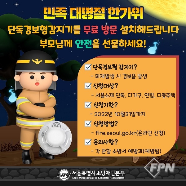 [FPN 정현희 기자] = 종로소방서(서장 이정희)는 추석 연휴 주택화재로부터 시민의 안전을 확보하기 위해 ‘따로 사시는 부모님께 단독경보형 감지기 선물하기’ 홍보 캠페인을 실시한다고 밝혔다.