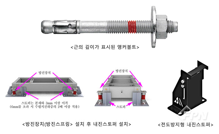 내진스토퍼는 지진하중에 의해 과도한 변위가 발생하지 않도록 제한하는 장치다. 소화펌프의 경우 평상시 상하로 기동함에 따라 그 진동을 경감하기 위해 통상적으로 방진가대를 설치해 무게를 준다. 방진장치(방진스프링 등)를 설치해 충격을 완화하되 과도한 변위가 발생하지 않도록 해 펌프에 무리가 없도록 설치한다.