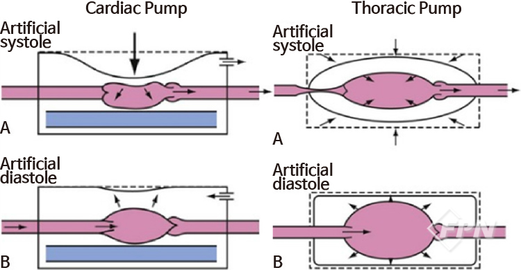 다른 하나는 흉강펌프이론입니다. 흉강펌프이론은 심장이 눌리는 것보단 흉강 압력이 변화하면서 흉강 내압과 외압의 차이로 인해 혈류가 유발된다는 이론입니다.
