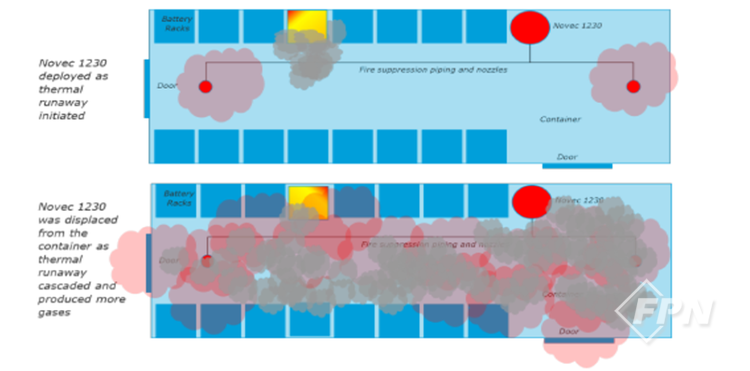 그런데도 소화약제는 리튬이온배터리 열폭주 발생 이후엔 전혀 소화에 효과가 없어 화재로 인한 엄청난 양의 연기가 발생했다. 게다가 이를 배출할 설비가 전혀 없어 내부엔 가연성ㆍ인화성ㆍ폭발성의 연기가 매우 높은 농도로 가득 차 있었다.