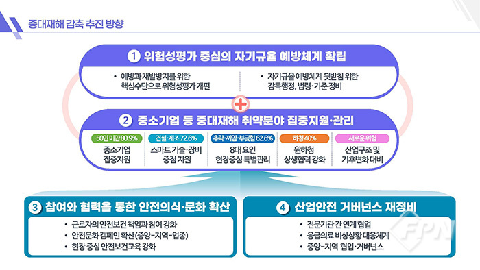 [FPN 최누리 기자] = 정부가 중대재해 감축을 위한 정책방향을 ‘처벌ㆍ감독’ 중심에서 ‘자기규율 예방체계’ 방식으로 전환한다. 이를 위해 노사가 스스로 사업장 내 위험요인을 진단ㆍ개선하는 ‘위험성평가’를 단계적으로 의무화하고 이를 뒷받침하기 위한 산업안전 법령과 기준도 정비한다.