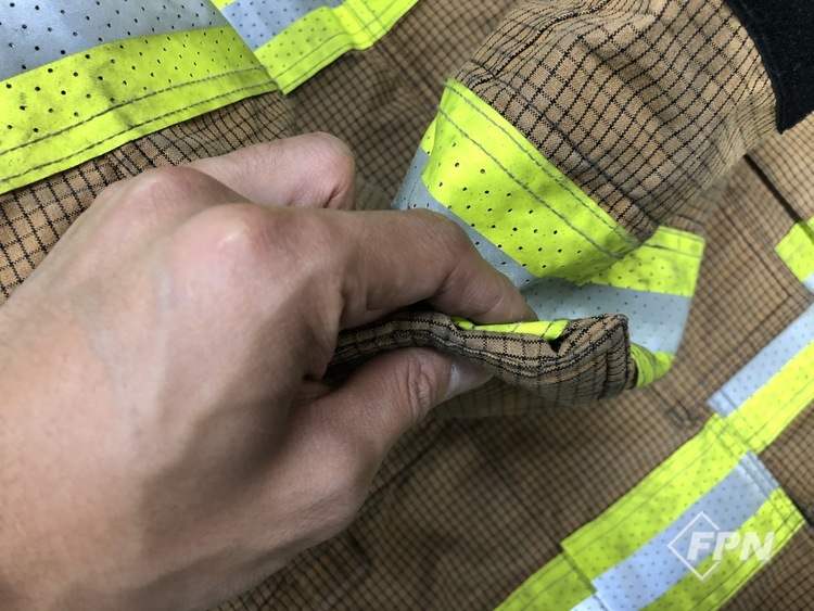 기존 방화복에 비해 색이 조금 어둡다 보니 현장에서 검은 재 등이 묻어도 티가 덜 나는 편이다. 방화복에 부착된 반사판의 박음질 상태는 매우 좋았다.