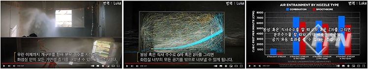 위 그림은 구획실 입구에서 봉상주수를 통해 O자나 N자를 그려 개구부가 있는 외벽으로 주수하면 개구부를 향해 분무주수를 하는 것과 유사한 효과가 있다는 실험결과다.