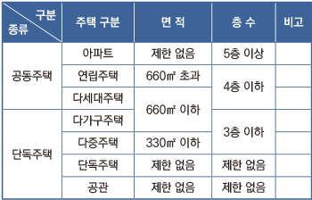 ‘주택법’에서 규정하는 단독주택과 공동주택으로 면적과 층수를 구분한다. 단독주택은 다가구주택과 다중주택, 단독주택, 공동주택은 아파트와 연립주택, 다세대주택 등으로 분류한다.