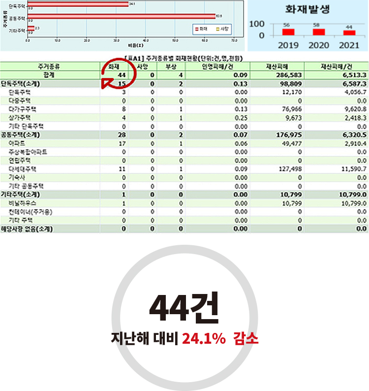 가장 위험한 곳이 돼버린 주택 1. 주택화재의 위험성 우린 얼마나 알고 있나? 가족들의 소중한 휴식처이자 편안한 생활공간으로 우린 많은 시간을 집에서 보내게 된다. 그래서일까? 아래의 2021년 발화장소별 화재현황 소방청 통계를 살펴보면 주거시설에서의 화재 발생과 인명피해 발생률이 다른 장소와 비교해 압도적으로 높은 걸 확인할 수 있다.