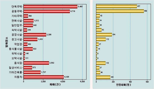 주거시설에서의 화재는 단독주택이나 다가구, 다세대주택에서의 사망사고 발생비율이 다른 주거시설에 비해 높다. 스프링클러 등 소방시설이 잘 갖춰진 아파트 등의 공동주택에 비해 단독, 다가구주택의 소방시설이나 도로기반시설 등이 열악한 게 이유로 지목된다.