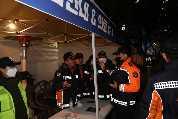 ▲ 이정희 종로소방서장이 제야의 종 타종행사 현장 상황실을 방문해 현장안전대책을 얘기하고 있다.