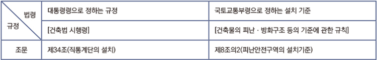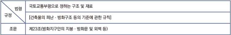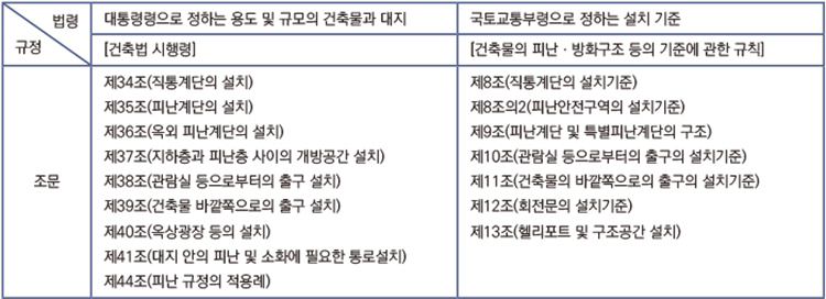 위와 같이 소방법령의 적용대상이 되는 ‘피난시설과 방화구획, 방화시설’을 ‘건축법’에서는 어떻게 규정하는지 구분해 봤다.
