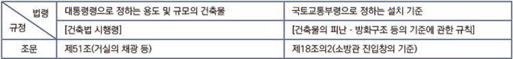 소방법령 적용 범위와 쟁점 사항 ‘건축법’ 제49조의 ‘피난시설 및 용도제한 등’에 대한 규정은 건축물의 안전에 관해 매우 중요한 요소다. 소방법령에서 건축 부분의 유지ㆍ관리 사항의 기본 전제가 된다.