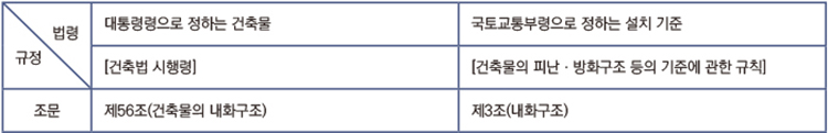 ‘건축법’에서 ‘피난시설, 방화구획’의 구분에 관한 사항은 피난, 안전, 위생, 방화(防火) 등의 많은 부분을 하나의 조문에 광범위한 내용으로 규정하고 있다. ‘방화시설’ 역시 각 항목에서 규정한 내용만으로 명확한 구분을 하기엔 어려움이 있다.