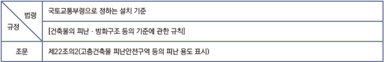 ‘피난시설, 방화구획’에 대해 열거하고 있는 규정들에 관한 분류 피난시설, 방화구획에 해당되는 시설의 구분은 ‘건축법’ 제49조의 5개 항에서 열거하는 규정에 따라 설치되는 세부 시설들의 종류 중에서 별도로 해당 시설을 분류해야 한다.