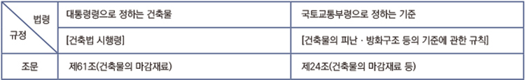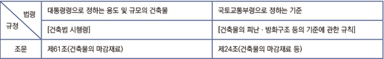 ‘건축법’엔 없지만 소방법령에서는 방화시설의 정의를 ‘건축법 제50조부터 제53조까지의 규정에 따른 방화벽, 내부 마감재료 등’으로 정의하고 있다. 소방법령 규정에 해당하는 ‘방화시설’에 관한 ‘건축법’에서의 세부규정은 다음과 같이 정리할 수 있다.