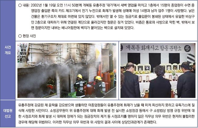 과연 이것들이 건축물의 용도와 규모에 따른 피난ㆍ방화시설로서 평상시 유지ㆍ관리해야 할 건지는 관계자뿐 아니라 감독행정기관에서도 판단에 상당한 어려움이 있다. 이는 대부분 화재 발생 피해의 책임에 관한 법원의 판결 결과로 학습하는 실정이다.