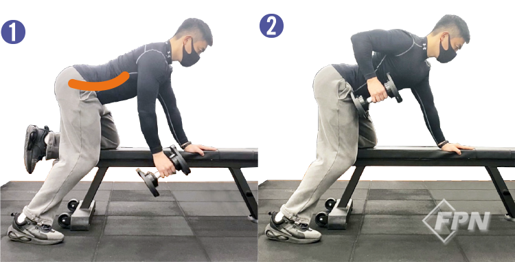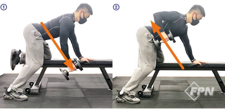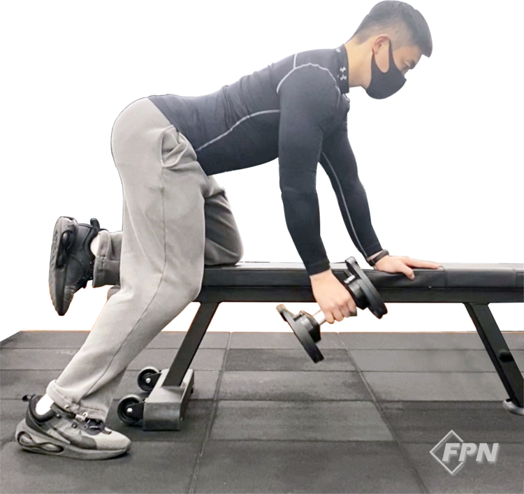 원 암 덤벨 로우 순서(오른쪽) ① 왼쪽 무릎을 벤치 위에 올립니다. ② 오른 다리를 벤치 오른쪽 뒤로 빼서 지지합니다. ③ 왼팔을 벤치 상단 쪽으로 올려 상체를 지지합니다. ④ 오른손으로 덤벨을 잡고 등 방향 쪽을 향해 그대로 덤벨을 당겨옵니다.
