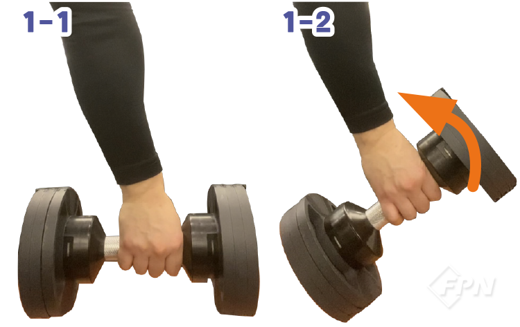 힘을 크게 들이지 않고 요골측 편위를 만드는 간단한 팁은 덤벨을 움켜쥘 때 손잡이 부분을 위쪽으로 올려 잡고 자연스럽게 덤벨을 아래쪽으로 떨어트리는 겁니다.