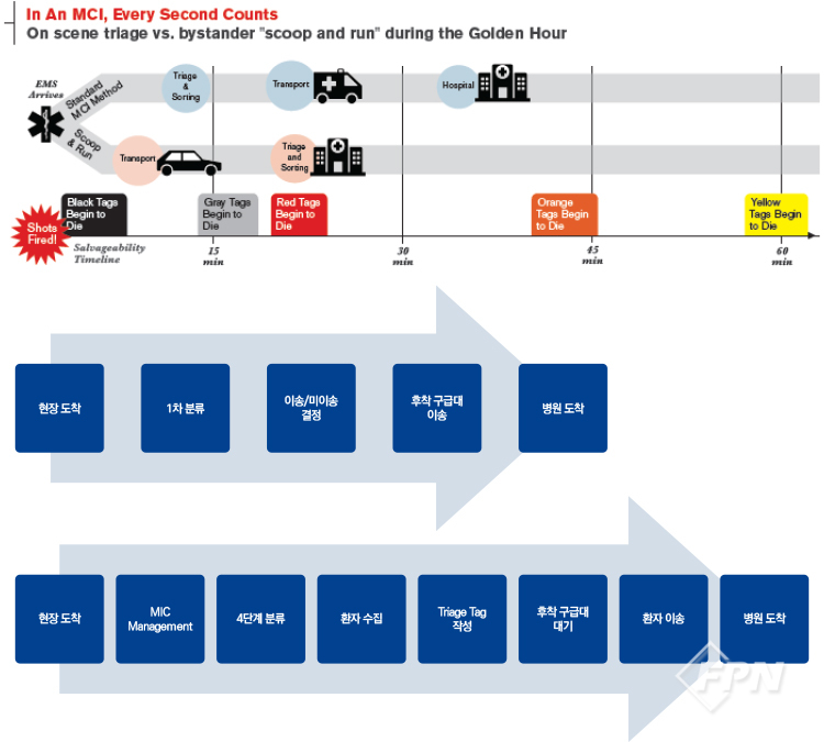 실제로 미국 캘리포니아 주 로스앤젤레스 카운티에서는 15분 내 50명의 환자를 이송할 수 있는 가이드라인과 장비가 준비돼 있고 이에 맞춰 빠른 분류와 이송에 초점을 맞춰 훈련하고 있다.