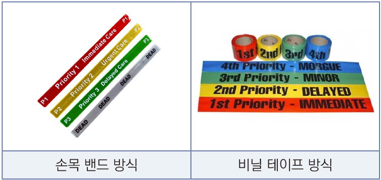 특히 레벨1, 2 규모의 Static MCI 형태의 다수 사상자 현장이라면 선착 구급대가 1차 분류를 하고 이송/미이송만 결정하거나 긴급 환자만 우선 분류하는 방법이 적절할 수 있다. 이때는 손목 밴드 방식이나 LED 형태의 목걸이 방식이 효과적이다.