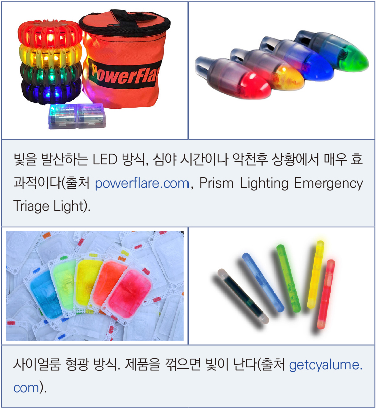 빛이 들어오는 형태의 분류 장비는 심야 시간이나 악천후 시 환자의 위치와 중증도를 쉽게 확인할 수 있는 장점이 있다. 단점으로는 건전지로 작동하기 때문에 방전되면 현장에서 사용할 수 없는 상황에 놓일 수 있다.