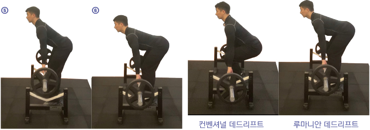따라서 처음은 컨벤셔널 데드리프트로 들어 올린 다음 ①~④까지 동작 진행 후 ⑤~⑥번 루마니안 데드리프트로 연결하는 방법을 추천해 드립니다.