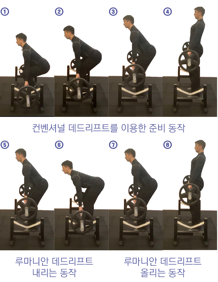 순서는 ①→②→③→④까지 컨벤셔널 데드리프트로 리프트한 후 다시 ⑤→⑥→⑦→⑧로 루마니안 데드리프트 동작을 이어 진행하고 그 후 ⑧→⑦→⑥으로 연계해 횟수를 늘려 운동하시면 됩니다.