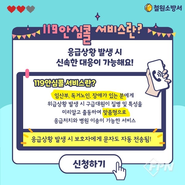 [FPN 정현희 기자] = 철원소방서(서장 정재덕)는 재난 취약계층, 고위험군 병력자 등에게 맞춤형 응급처치를 제공하는 ‘119안심콜’을 추진한다고 밝혔다.
