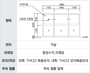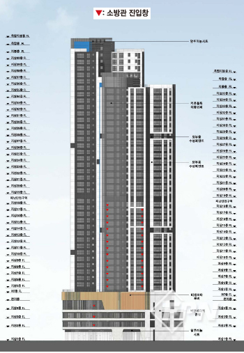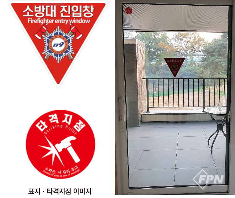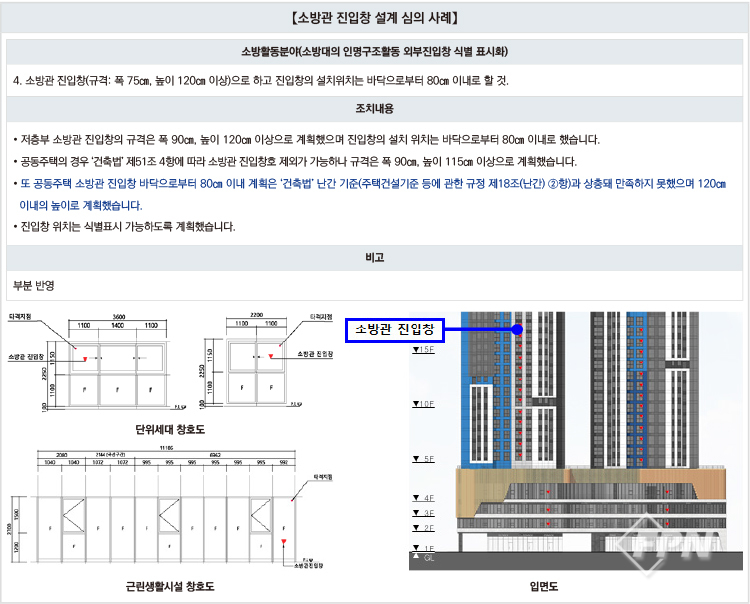 따라서 소방관 진입창을 별도로 설치하지 않아도 소방관 진입이 가능한 구조라 설치가 제외된다. 그러나 반드시 소방 고가사다리차 등이 접근해 부서할 수 있는 위치에 설치해야 하는 걸 명심해야 한다.