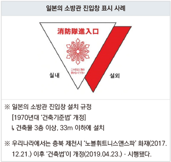 이 규정은 일본의 ‘건축기준법’에서 규정하는 소방관 진입창의 설치범위와 간격, 조건 등을 참조해 국내 현실에 맞도록 제도화됐다.
