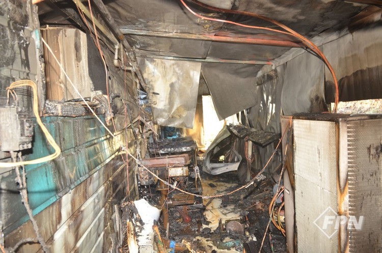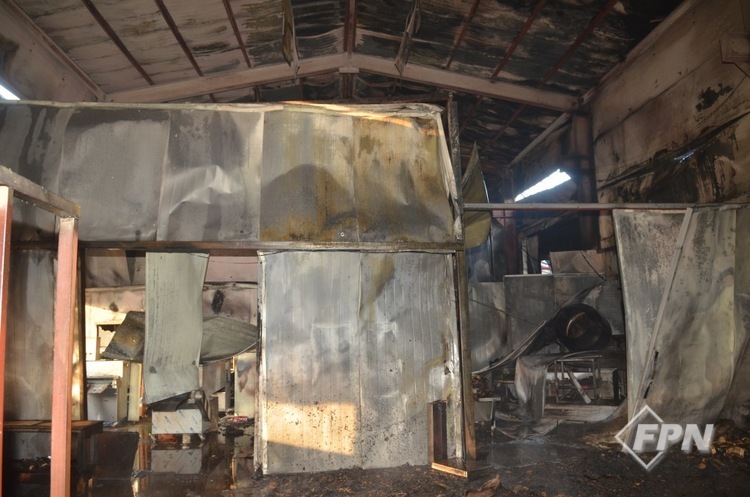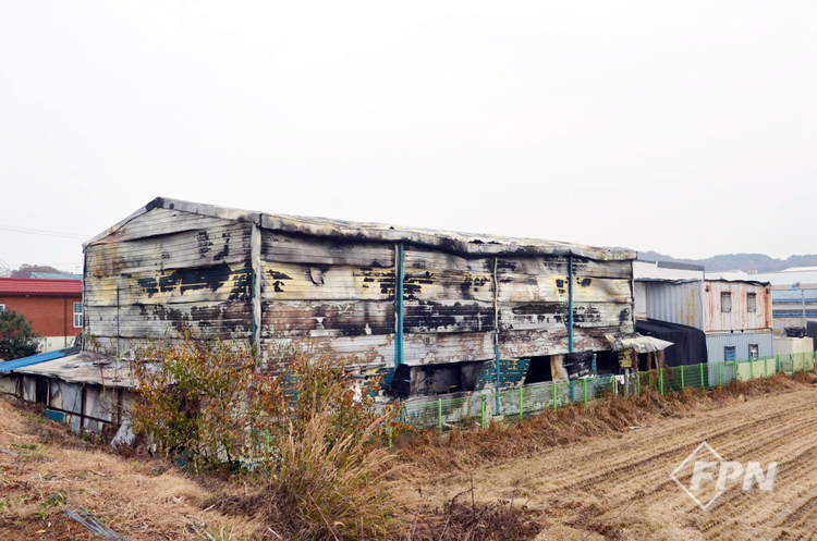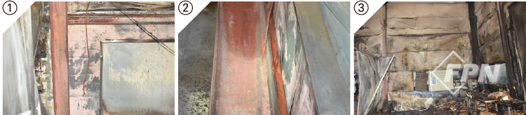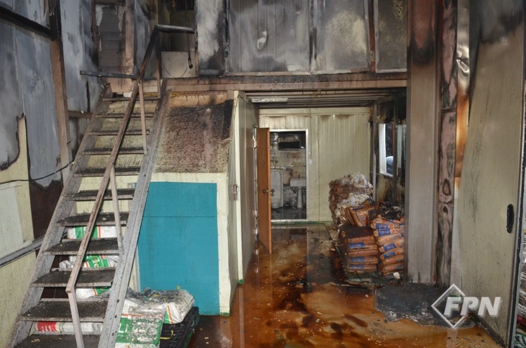 건조실 옆에 구획한 부분은 복층으로 축조돼 있었다. 2층은 교반실이고 내부 탄화 정도가 심하게 관찰됐다. 출입문에 잔류한 수열 형태를 볼 때 교반실 내부에서 외부로 출화한 형태로 판단된다. 교반실 하단 1층 샌드위치 패널 도색은 원형으로 수열 형태가 전혀 관찰되지 않았다.