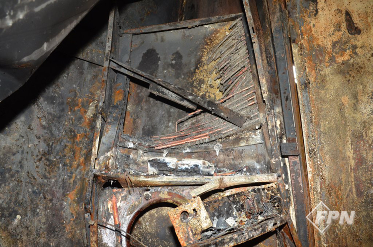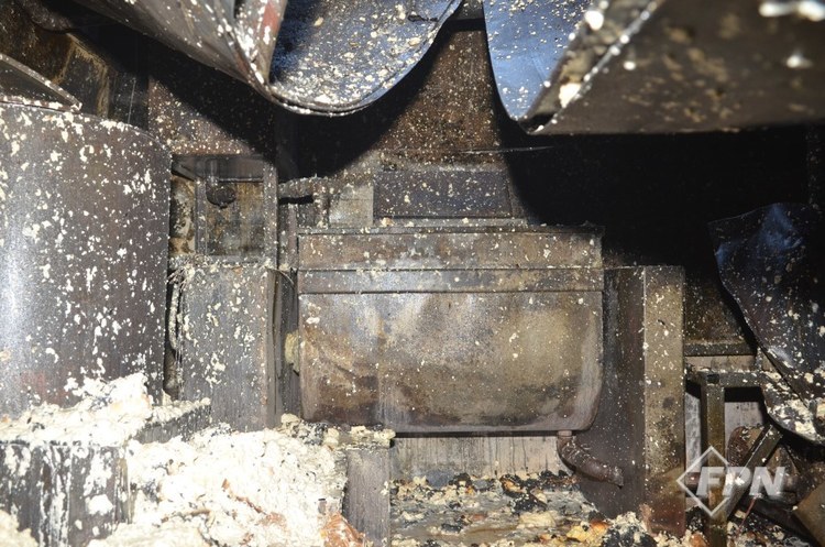 [사진 5]의 성형기, 건조로 좌측 벽면과 정면의 샌드위치 패널이 연분홍색으로 변색한 건 직접 화염보다 반대쪽에서 수열 받아 전도된 형태로 판단했다.
