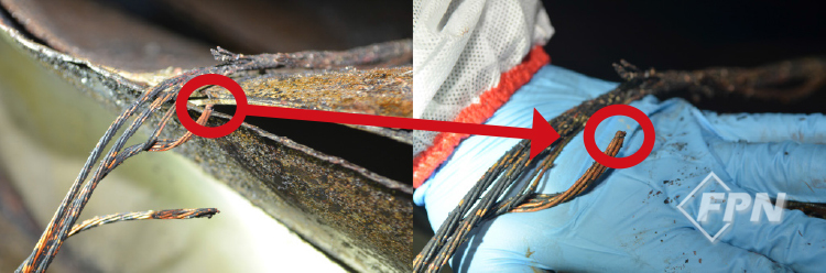 에어컨 실내기 측면을 통해 교반기로 연결되는 전선에서 다수의 특이점이 관찰된다. 소훼 상태나 용융 형태가 심하고 일부에는 단락 흔적이 보이나 이게 단락 흔적인지, 용융인지를 확언해 단정할 수 없었다.