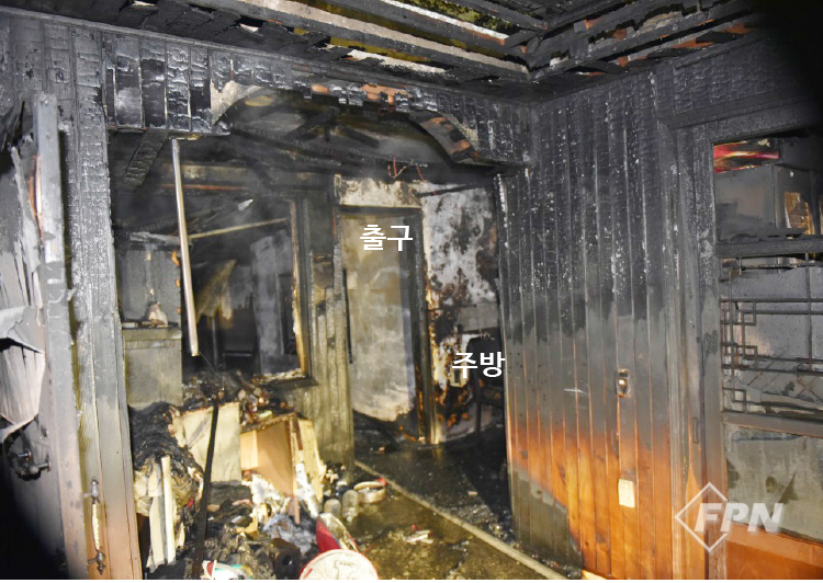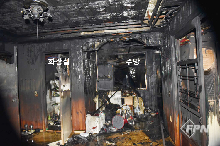 주방과 화장실은 전체적으로 천장 부분의 소훼 상태가 심하고 중성대가 형성돼 있다. 즉 상단은 연소하고 하단은 미연소 상태로 잔류했다.