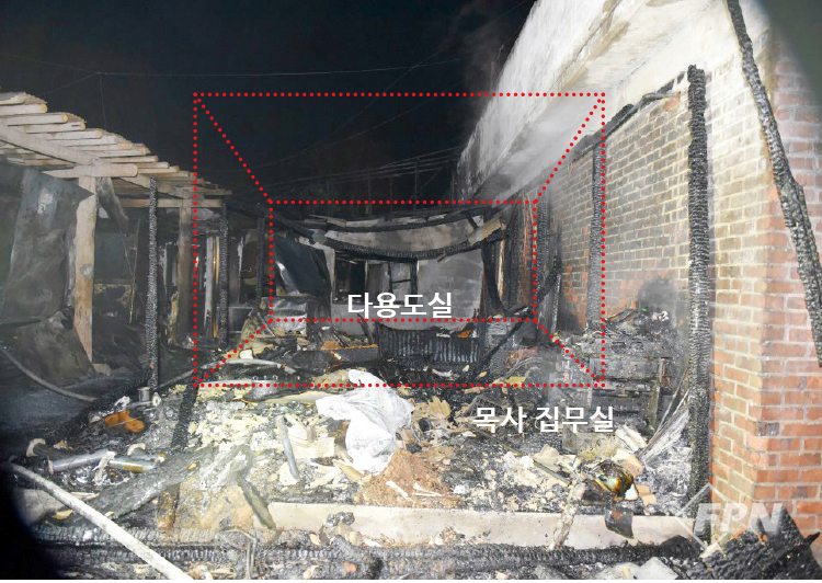 따라서 다용도실에서 주택 내부로 화염이 진행됐다고 판단했다. 이는 목격자 이 씨의 진술과도 일치한다. 이에 발화지점은 집무실과 다용도실이고 주택과 예배당으로 연소 확대됐다고 파악했다. 화재로 인해 수익 발생이 없는 것으로 볼 때 내부인의 방화 가능성은 작은 것으로 생각된다. 또 발화 시간은 새벽으로 외부인의 출입이 없는 상태였다.