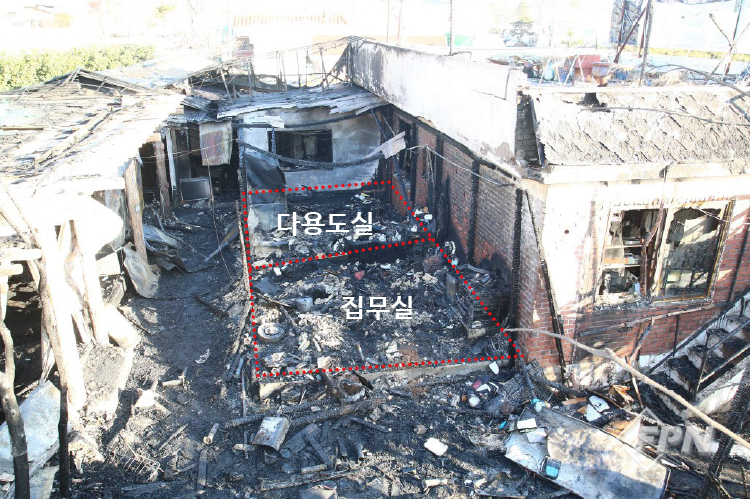 물론 집무실이나 다용도실에 잔류한 탄화물로도 방향성 판단이 가능하지만 천장이 소실되고 붕괴한 상태에서 내부 가연물의 방향성을 판단하는 건 오류가 생길 수 있다. 다용도실 내부에 김치냉장고 2, 일반 냉장고 1대가 있었으나 출화 흔적이나 전선에서 특이점이 관찰되지 않았다.