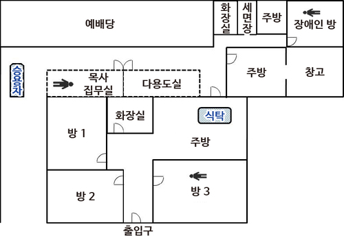 [그림 1]과 같이 주택 본채에 방 3개와 주방 화장실이 있고 측면으로 주방과 장애인 방, 그리고 주방, 세면장, 화장실, 예배당이 있다. 목사 이 씨는 목사 집무실, 장애인 유 씨는 장애인 방, 화재 사실을 알렸던 이 씨는 방 3에서 발견됐다.