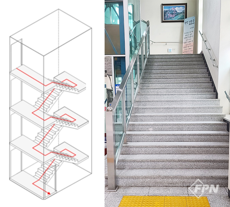 또 계단참이 돌음구조로 설치된 돌음계단이 있는데 하나의 계단 형태지만 피난계단의 구조로서는 적합하지 않다.