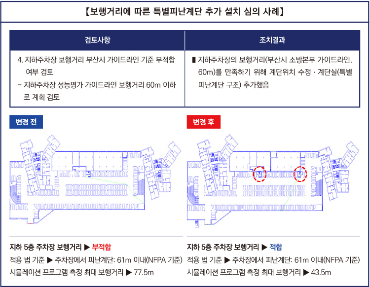 현재 소방청의 성능위주설계(PBD) 평가 가이드라인에서는 ‘주차장은 보행거리 기준이 50m 이하가 되도록 계단을 배치하고 계단 인근에는 폭 1m 이상의 피난 경로(픽토그램)를 표시’하도록 권고한다.